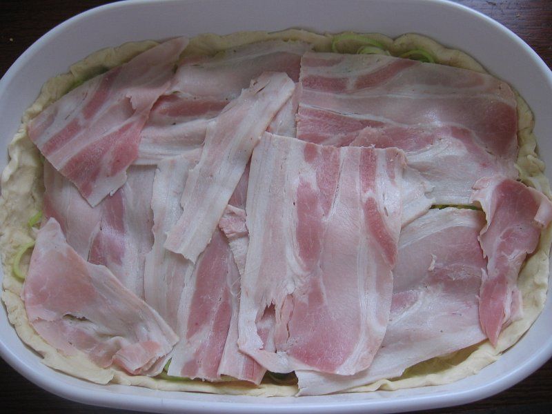 listnato testo, por, panceta, sir, ter preliv iz jajc in kisle smetane