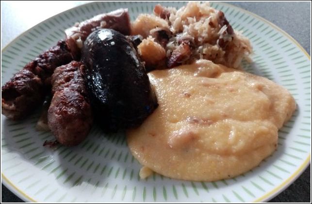 Podvarak, polenta s suhimi paradižniki, pečenica in krvavica