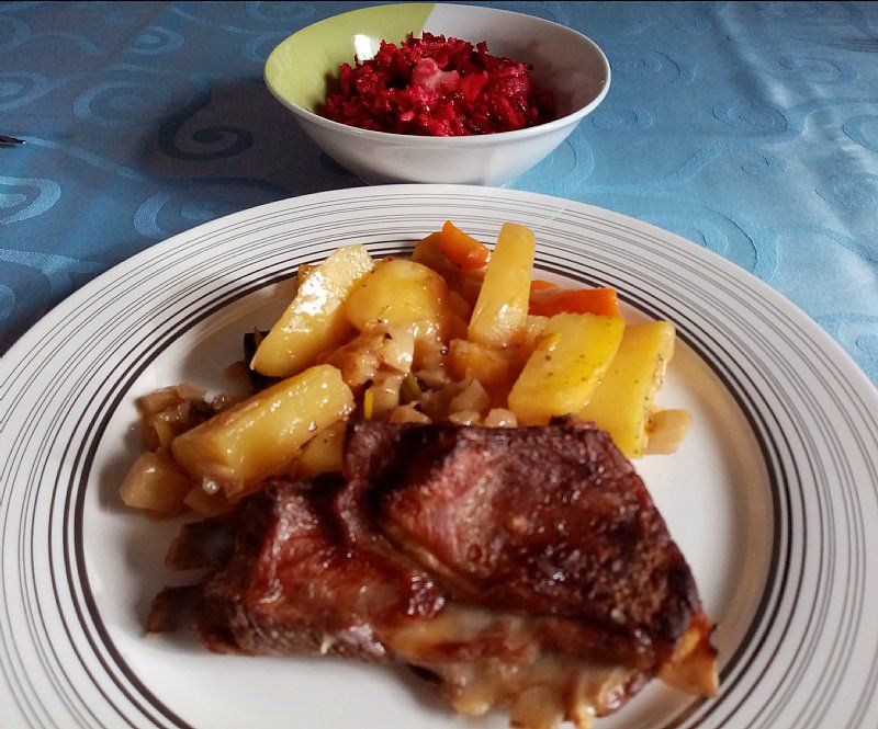 Rizi-bizi, pečena vratovina prelita z vinsko omako