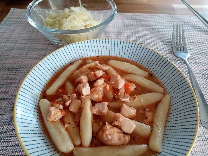Piščančji zrezek paniran po pariško, zelenjava iz voka, žlikrofi