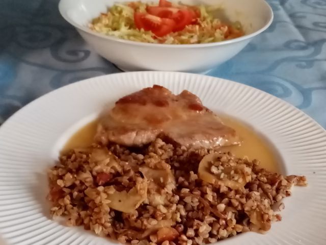 Ajdova kaša z jurčki, popečena vratovina, vinska omaka