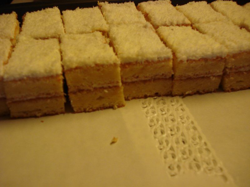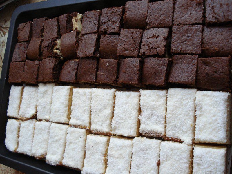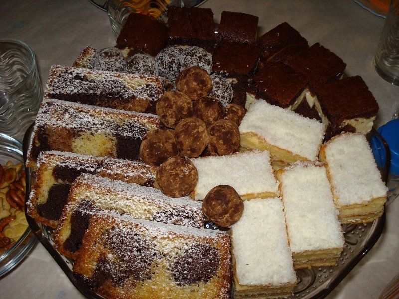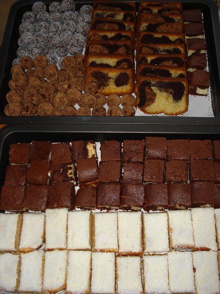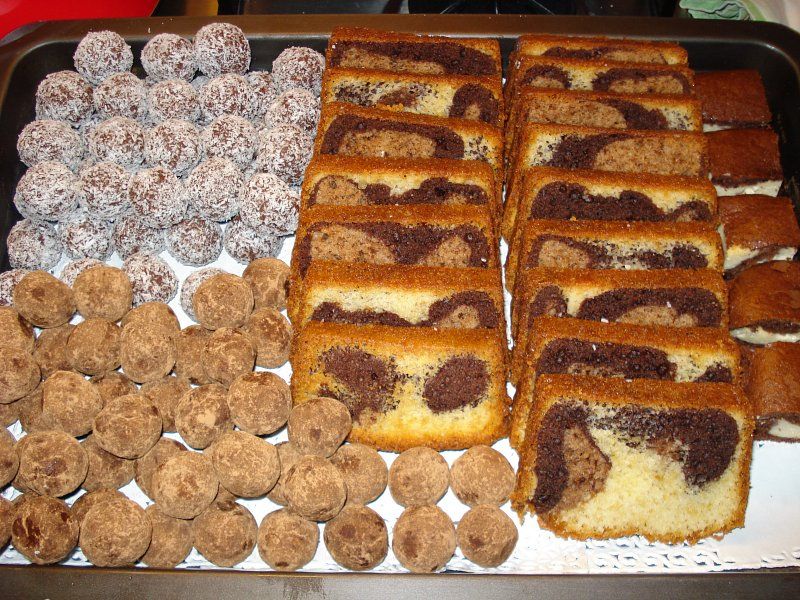 pinna kocke in biskvit s skuto, ter marmorni kolač, rumove in jaffa kroglice