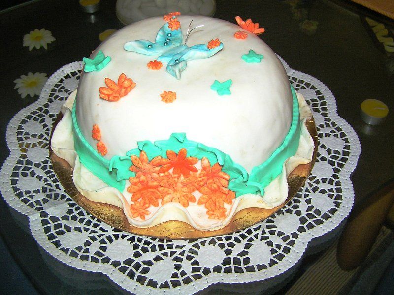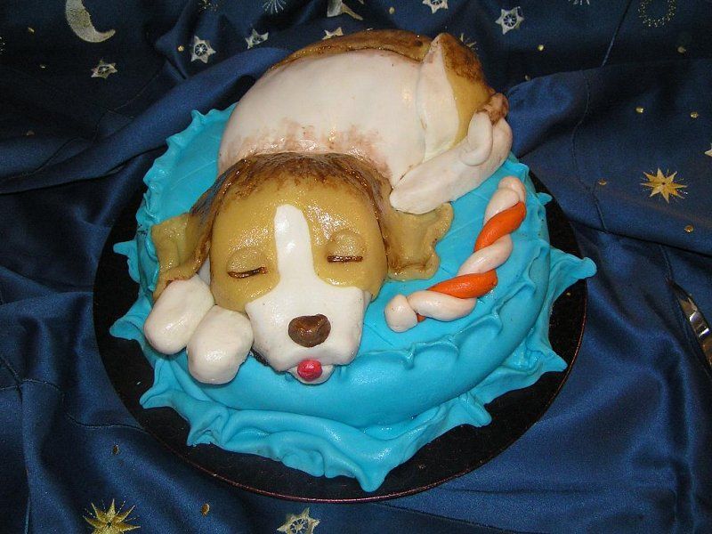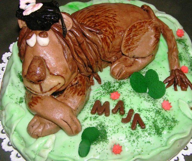 torta kužek - iz mase za 3D oblikovanje tort, spodaj torta jaffa