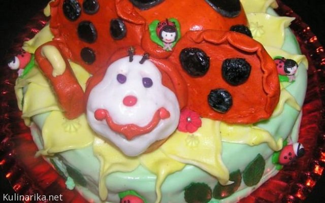 torta pikapolonica - iz mase za 3D torte, spodaj torta z malinovo-robidovo kremo