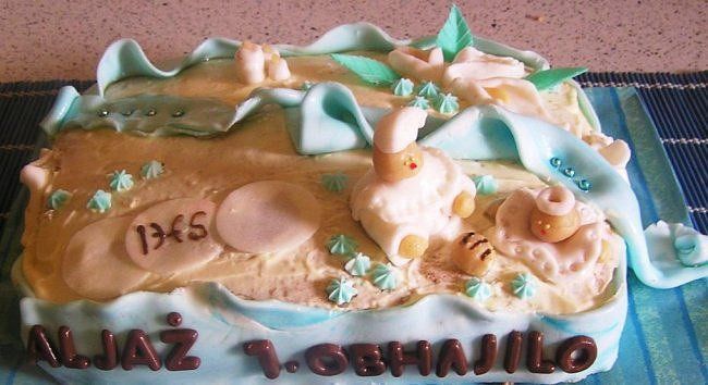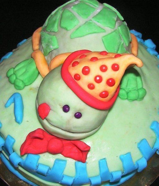 želvica iz 3D mase, spodaj torta z jabolčno puding kremo