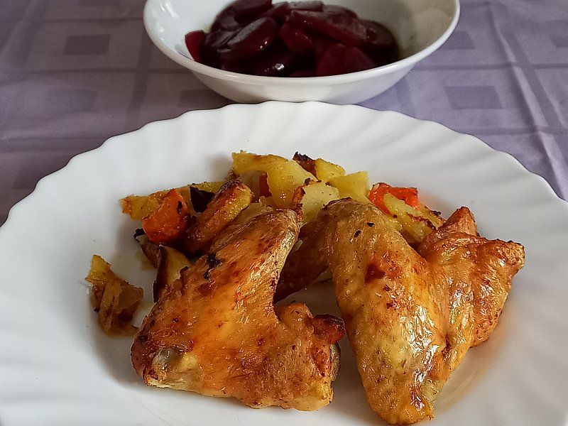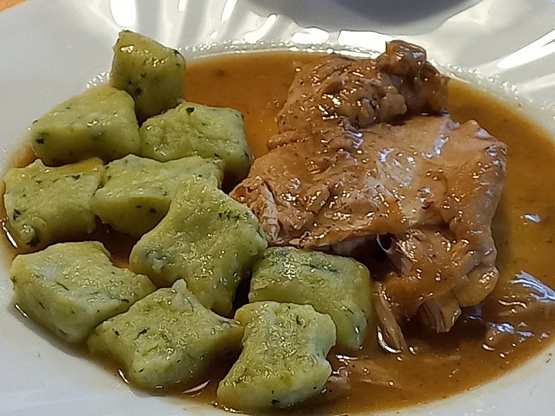 Piščančji paprikaš, ščipaanci; radič in zelje s krompirjem na solato