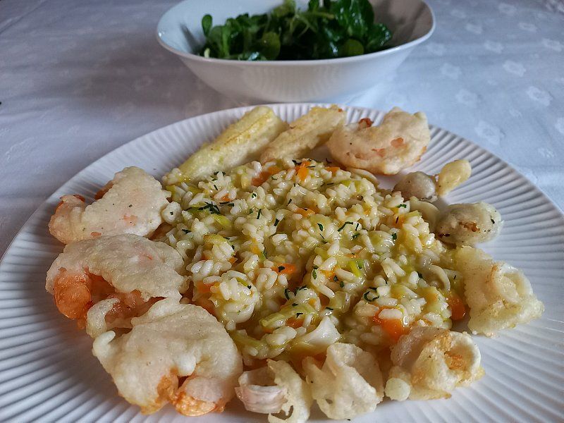 Zelenjavna rižota, kozice in lignji v tempuri; motovilec
