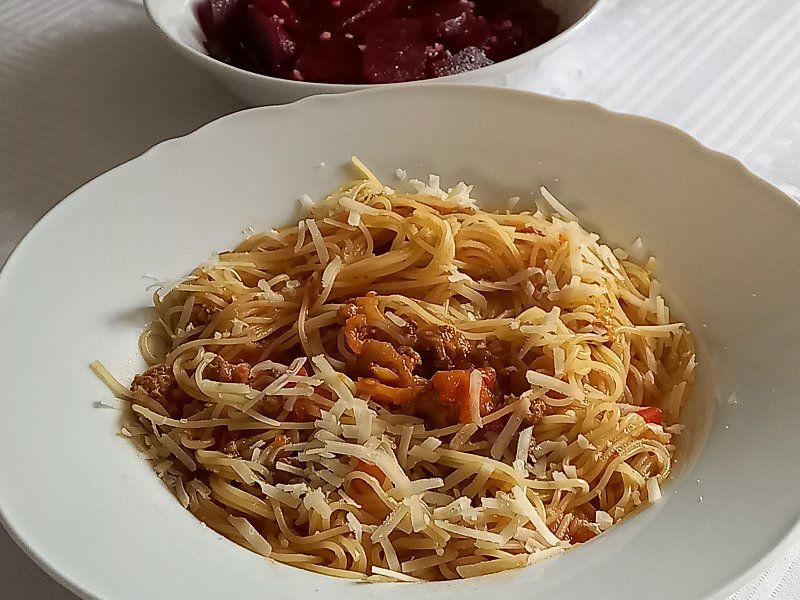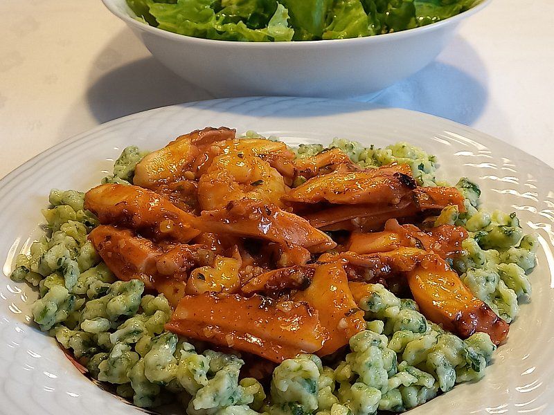 Špinačni špecli; "kraki orjaškega lignja" na česnu in vinu; zelena solata