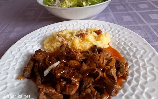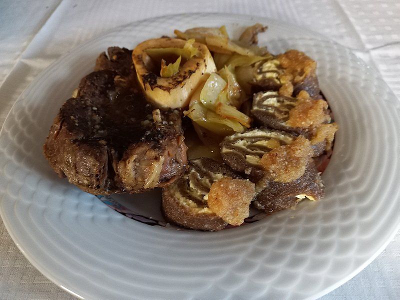Pražena jetrca, polenta z ocvirki; endivija z naribano redvkico