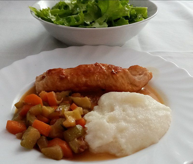 Piščančji zvitki s sirom in šunko, Zelenjavna mešanica, grez; zelena solata
