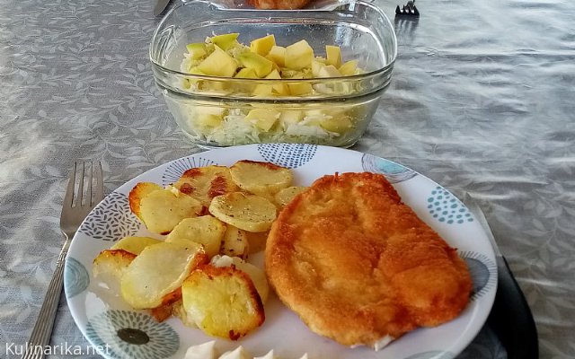Pečen krompirček, panirane pišč, zrezki; zeljnata solata s krompirjem in avokado