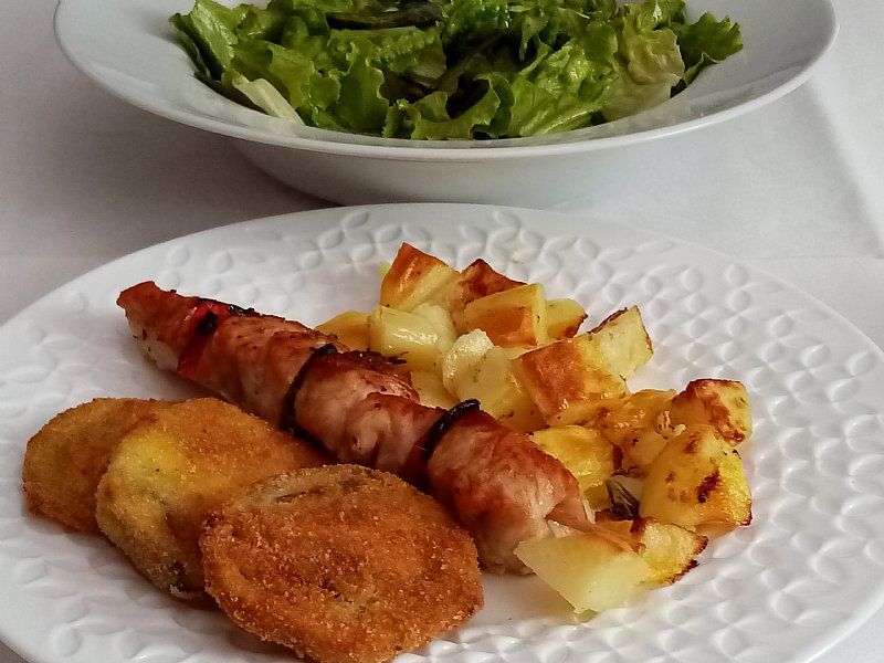 Pečen krompirček, piščančje nabodalo, panirani malancani; zelena solata s stročj