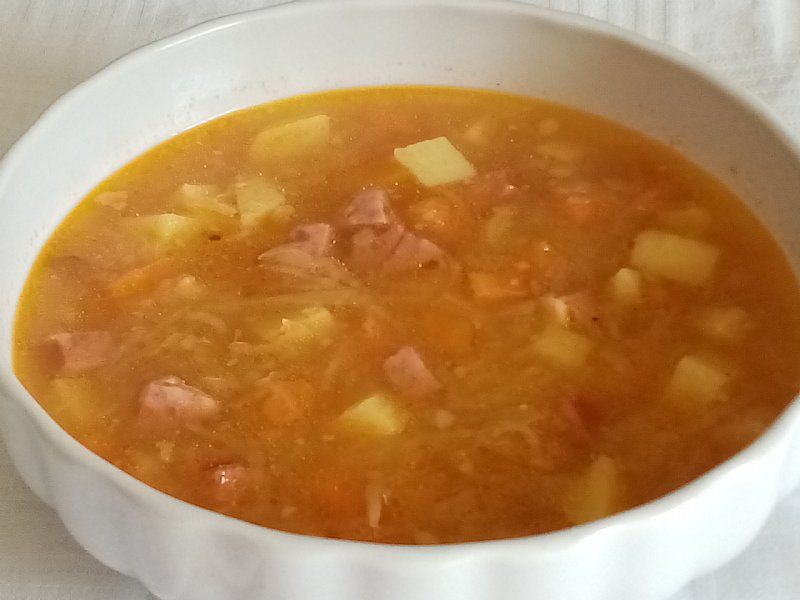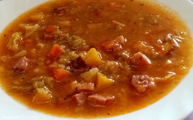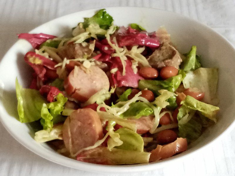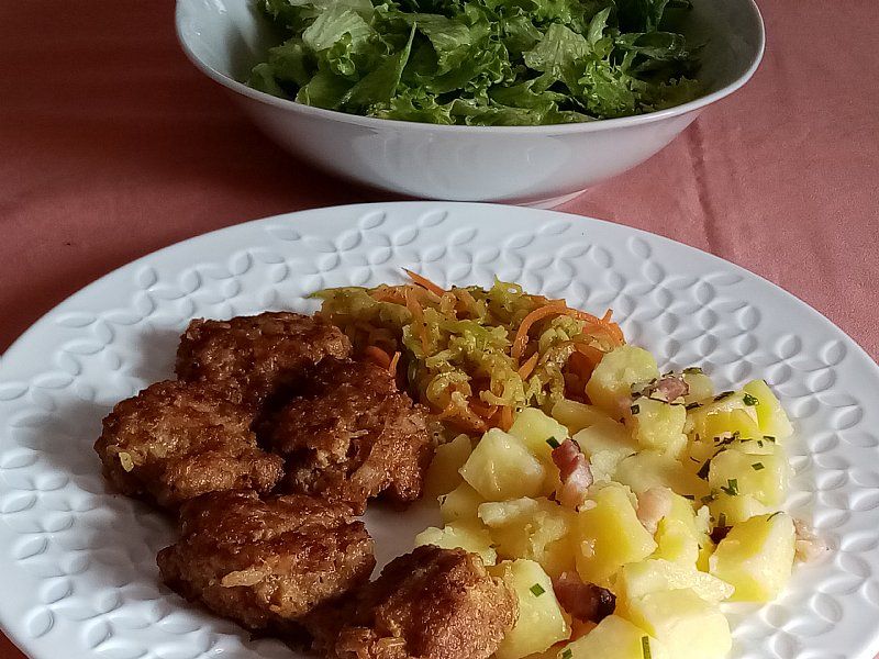 dušeno zelje, zapečena polenta/pšenični zdrob, krvavica