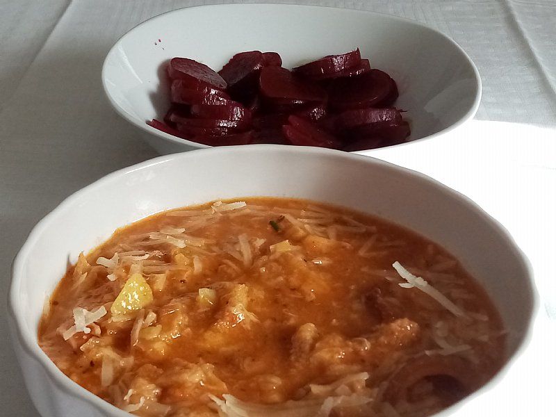 Meso na trakce, zelenjava v voku, široki rezanci; rdeča pesa
