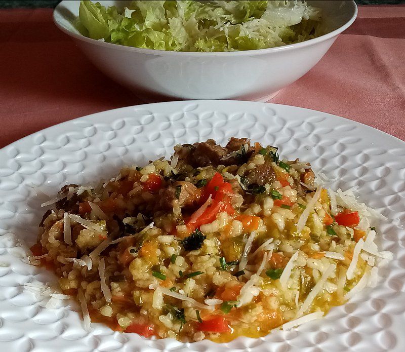 Telečja rižota z rdečo papriko in porom; kristalka in zeljnata solata