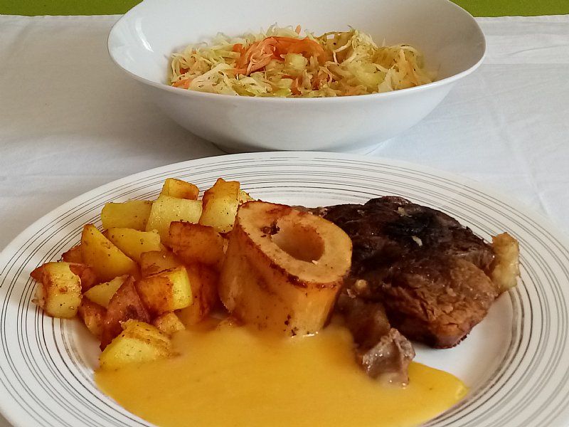 osso bučo, popečen krompir, pomarančna omaka; zeljnata solata s korenčkom in kro