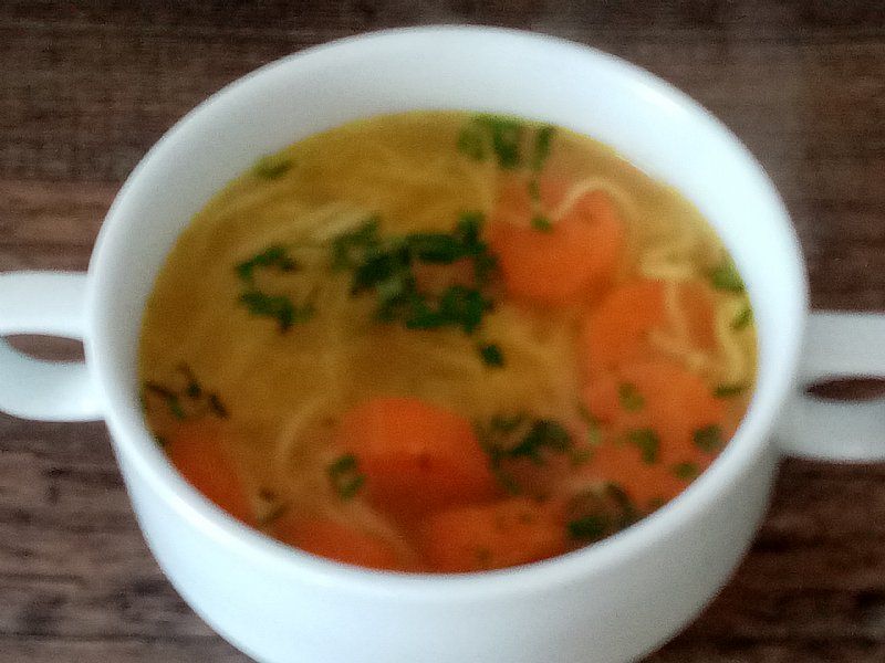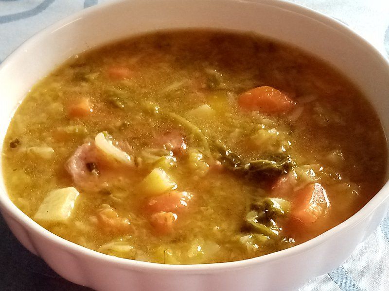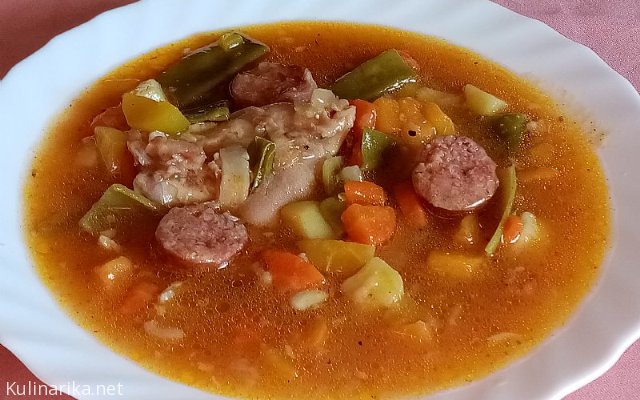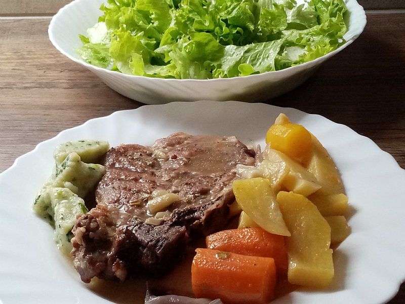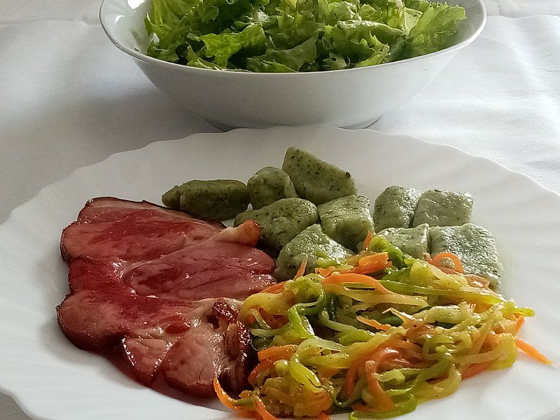 zeleni njoki, rezina prekuhane suhe krače, popečeni bučkini in korenčkov rezanci