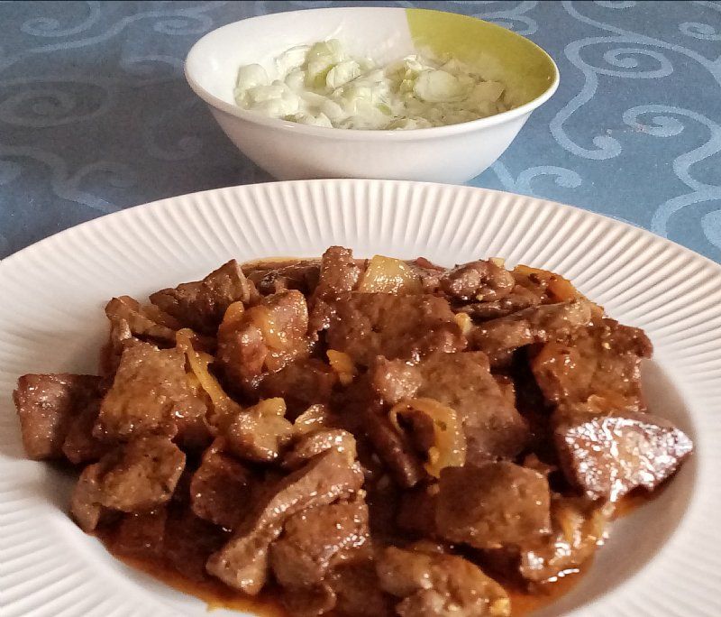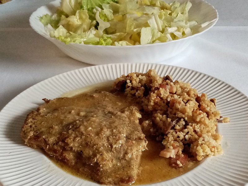 Goveji zrezki v omaki, bulgur na slanini in šampinjonih; štrucar s krompirjem.