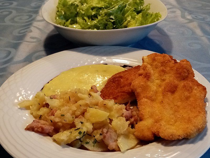 Pražen krompir, panirani pišč. zrezki, hrenovo-kumarična omaka; zelena solata
