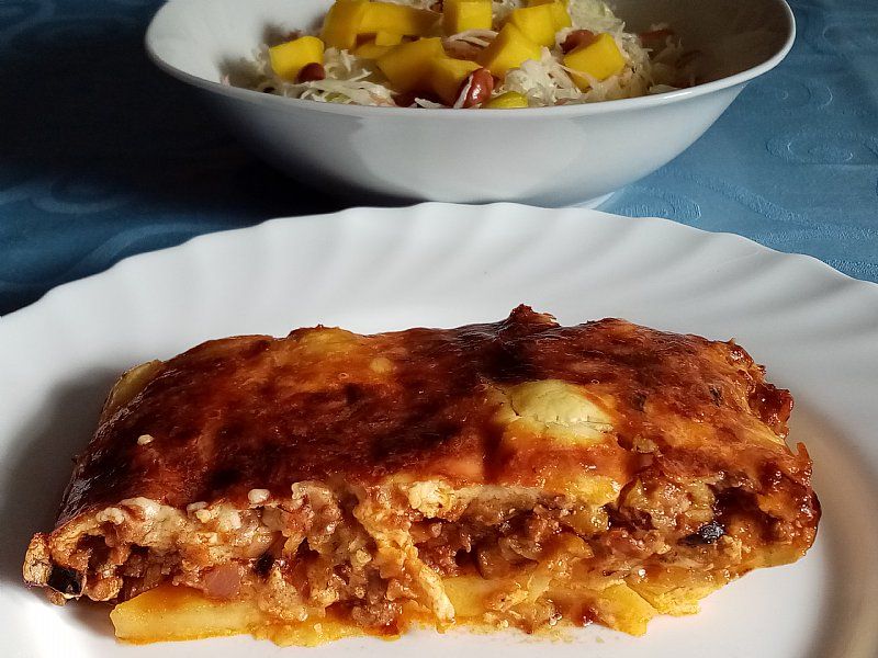Musaka (krompir, malancani); zelje, fižol, korenček na solato