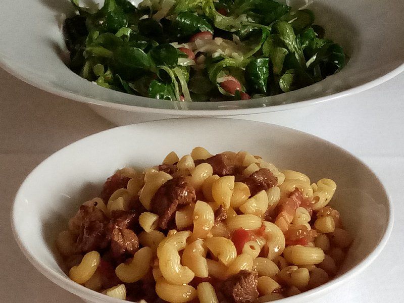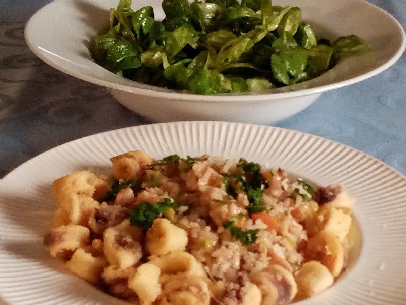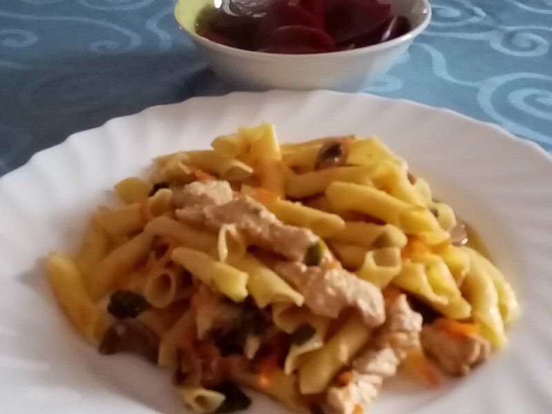 istrski fuži v omaki (por, korenček, šampinjoni, puranje kocke, vino); rdeča pes