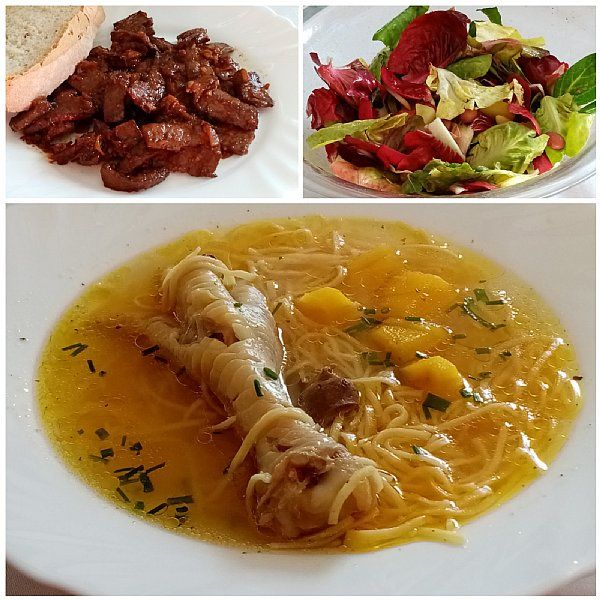 Rizi-bizi, puranji zrezki v omaki; pečeno piščančje meso; rdeča pesa