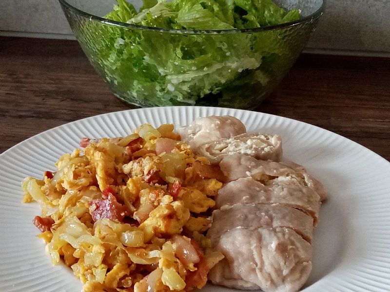 Ajdovi štruklji, paprika na poru in čebuli z rezinami pršuta; zelena solata