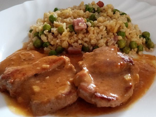 Bulgur s korenčkom, bučkini rezanci v voku, popečena govedina, vinska omaka; štr