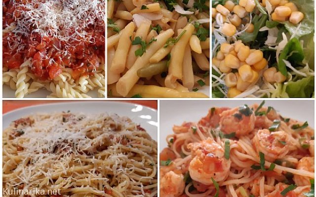 Špageti s česnom in čilijem, pečeni riževi rezanc z rakci,svedrčki s parad.omako