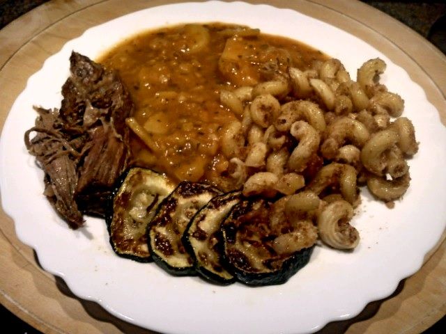 Krompirjev golaž, govedina iz juhe, makaroni z drobtinicami, popečene bučke