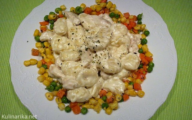 koščki piščančjih prsi in njoki v smetanovi omaki s pisano zelenjavno prikuho