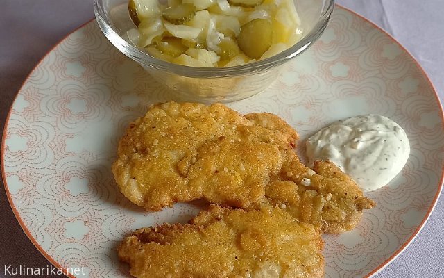 Krompirjeva solata, paniran piščančji zrezek, koprov zos
