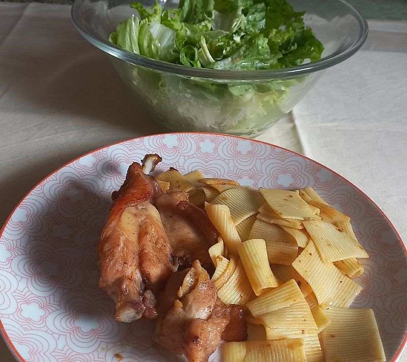 Pečeno piščančje bedro, krompir; zelena solata z zeljem
