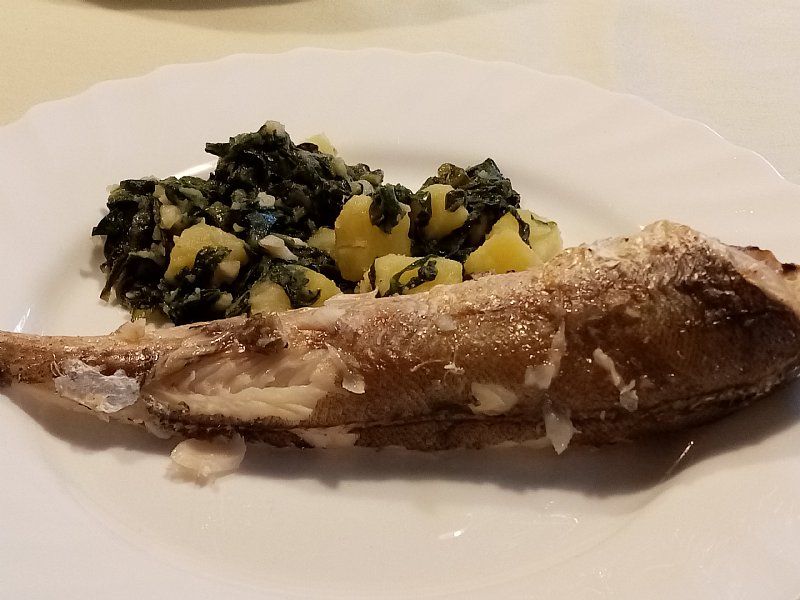 pečen oslič; radič s fižolom in črno redkvico