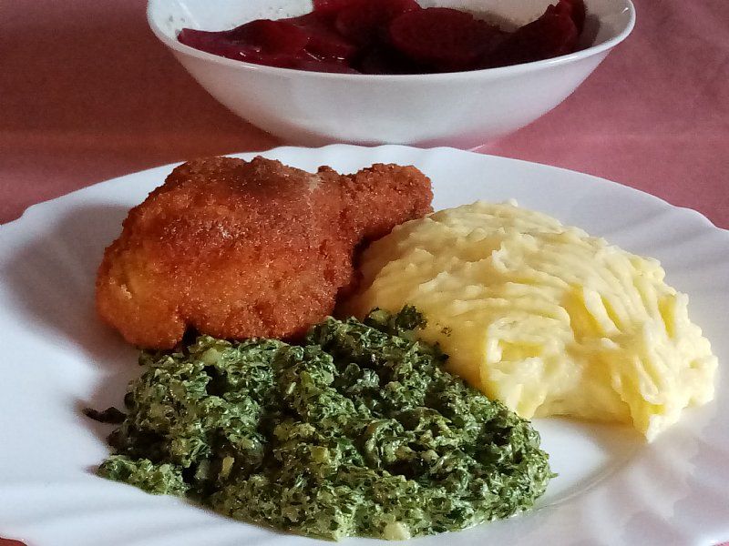 Pohano piščančje bedro, pire krompir, špinača; rdeča pesa