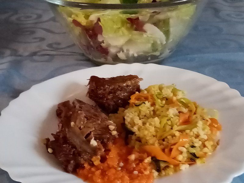 Bulgur s korenčkom in bučko, popečena govedina z omakco