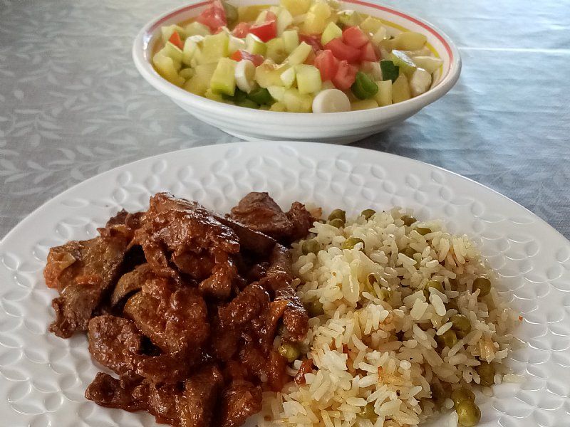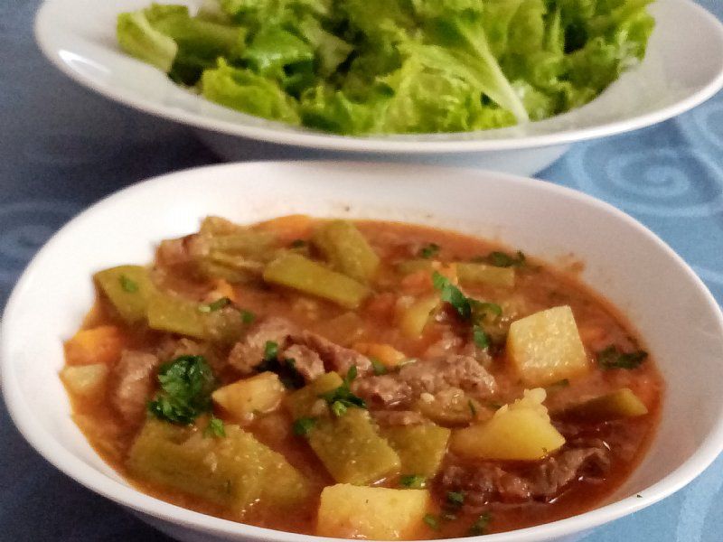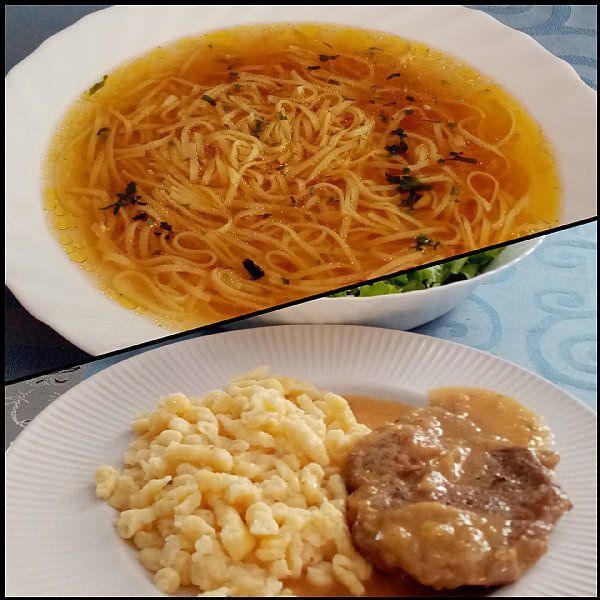 Goveja juhica z domačimi rezanci; vratovina v vinski omaki, špecli; zelena solat