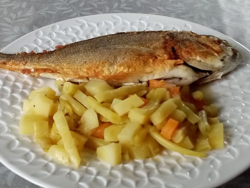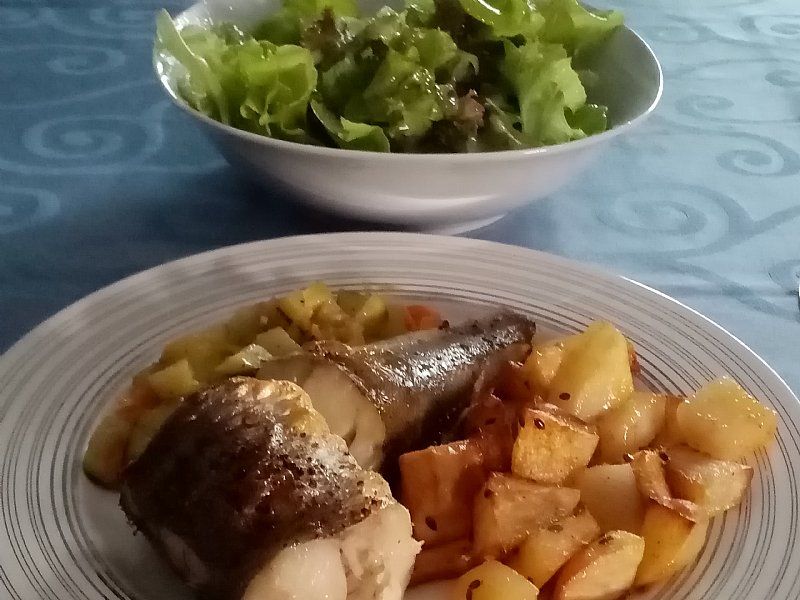 Pečeni oslič in krompir, dušene bučke; zelena solata