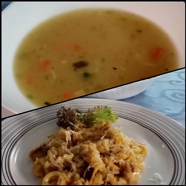 Gobova juhica; dušena bučka in korenček, piščančji zrezek po pariško; zelena sol