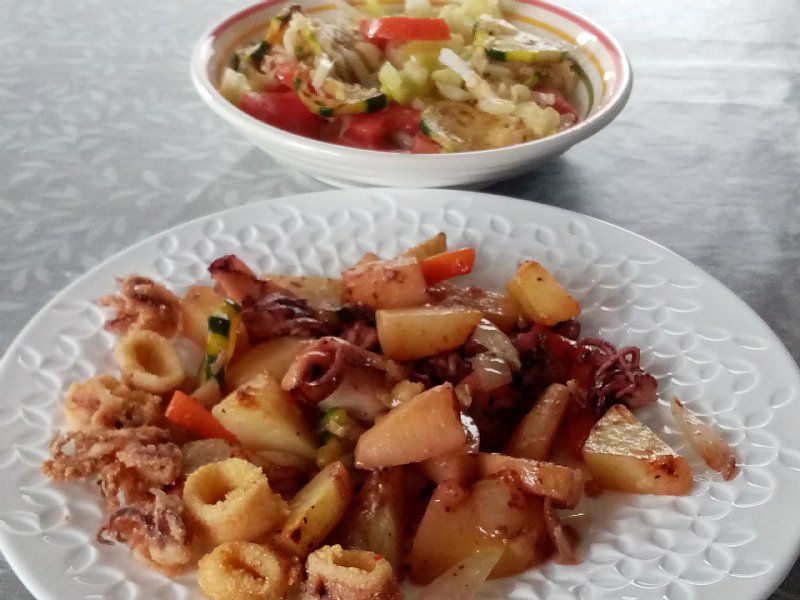 Rižoto z lignji, še malo praženih lignjev; zelena in zeljnata solata