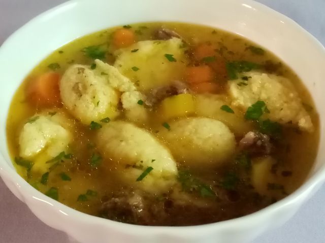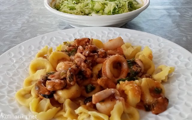 Ravioli s pršutom, morski plodovi v vinski omakici s česnom; zeljnata s krompirj