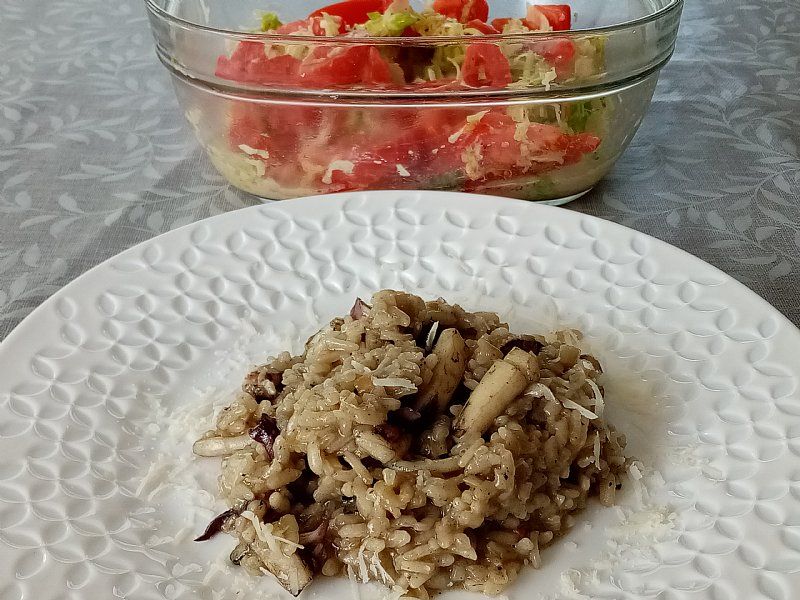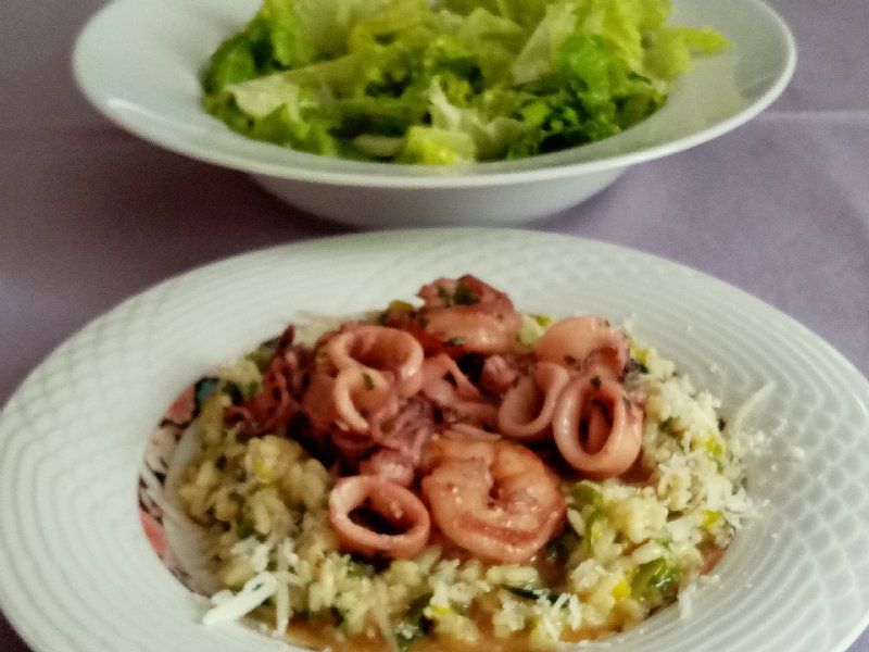 Porova rižota, kozice in lignji s česnom; zelena solata