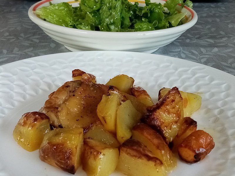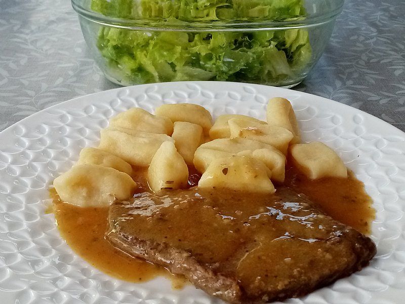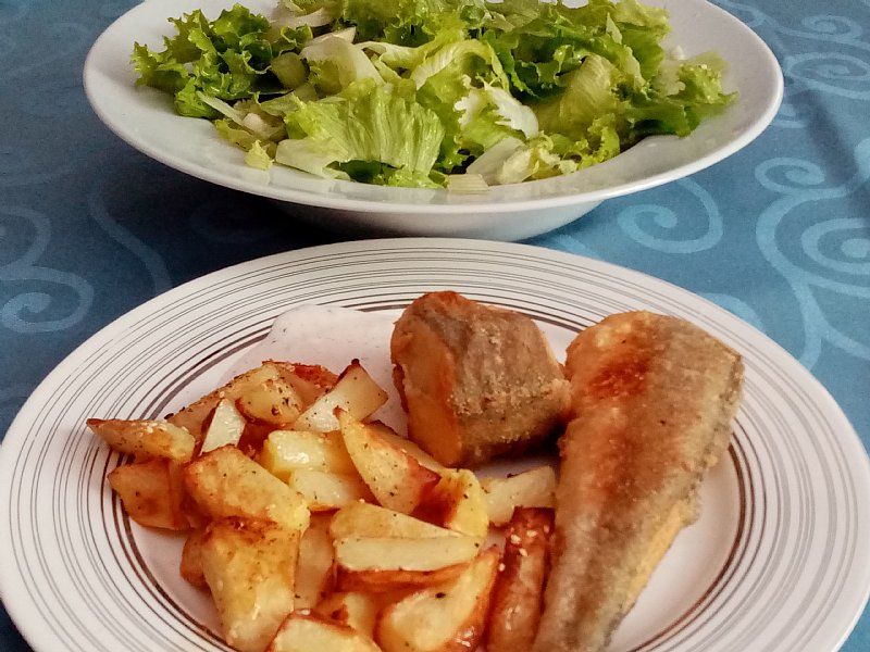 pir, oslič, omaka = kisla smetana, majoneza, drobnjak, česen; zelena solata, mla