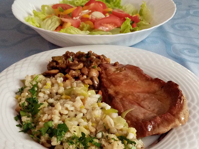 Ričeta s porom in bučko, šampinjoni v vinski omaki, vratovina; zelena solata s p
