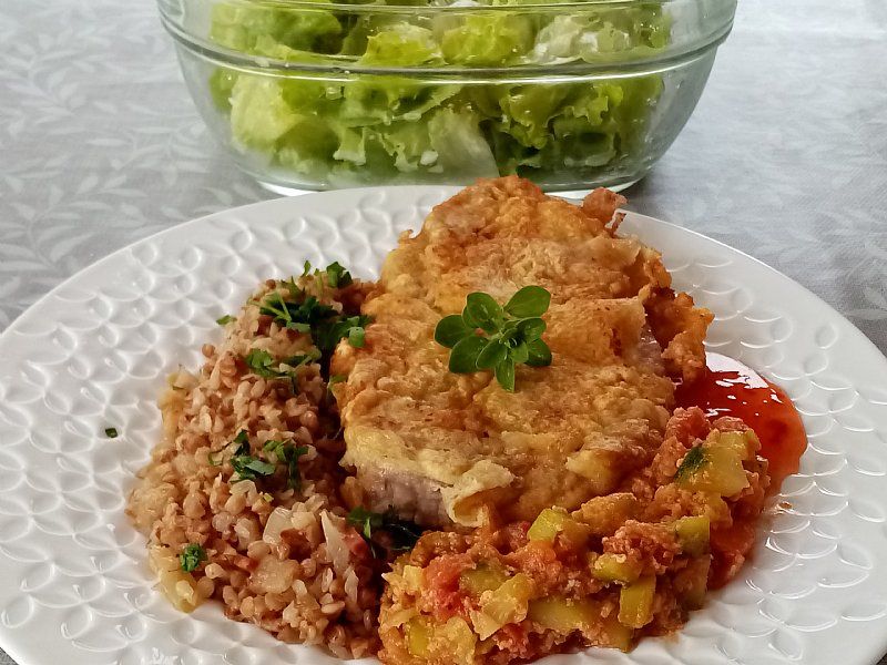 Ajdova kaša na slanini, dušene bučke s šalšo, po pariško panirana vratovina; zel