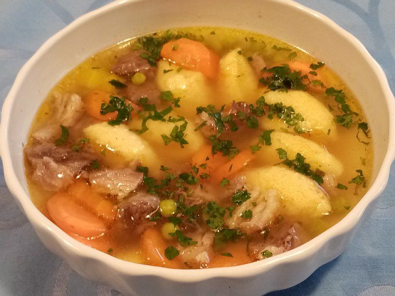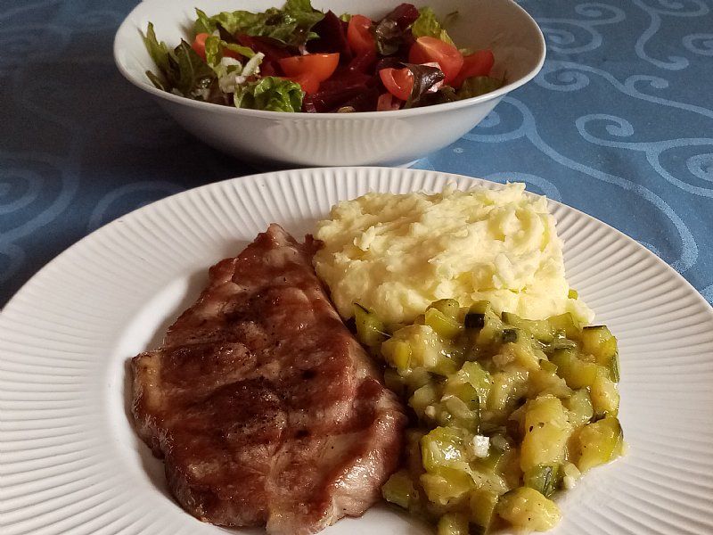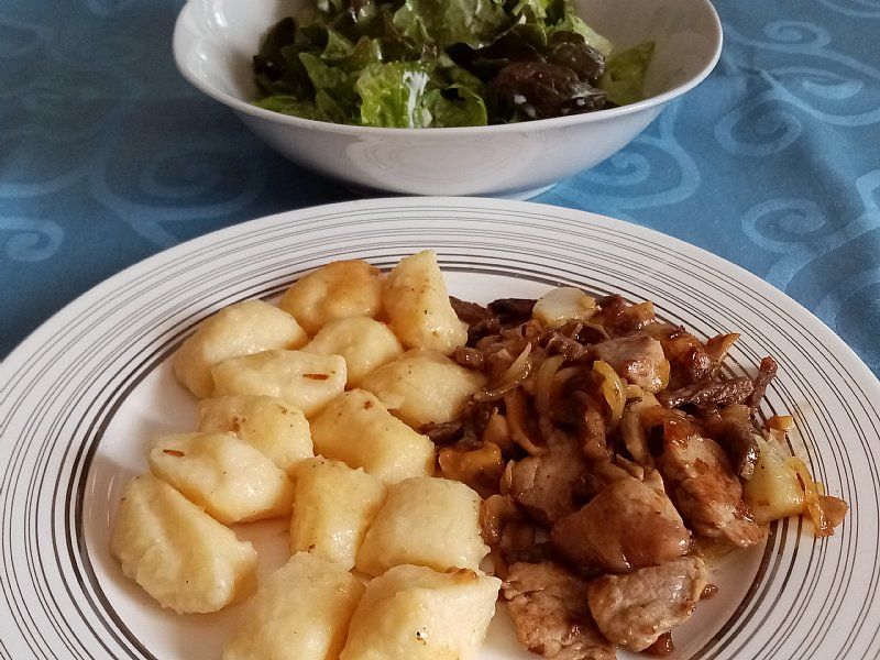 Prepraženo sv. meso, šampinjoni, čebula, podlito z vinom, njoki (iz zaloge); zel