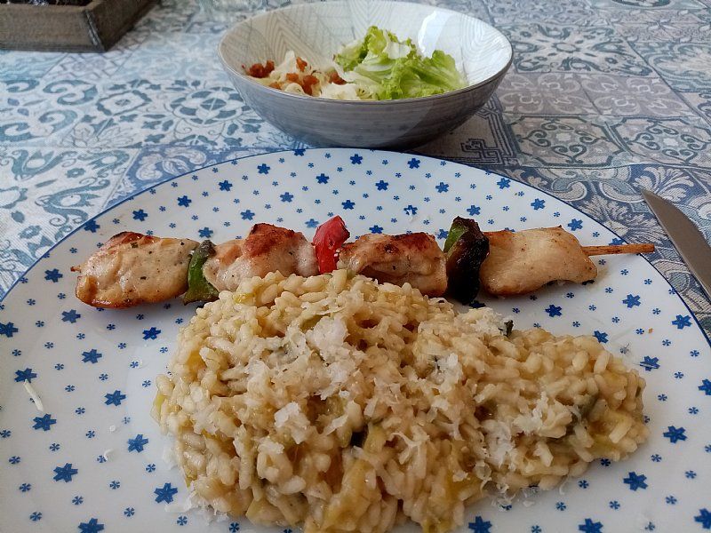 Porova rižota, pišč. nabodalo, zeljna in zelena solata