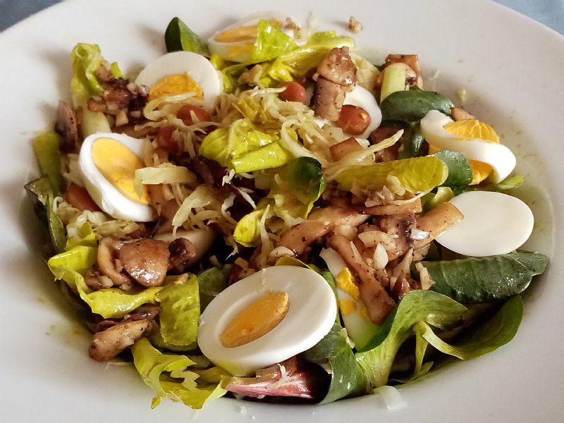 Piščančje-porova rižota, zelena solata z rdečo peso