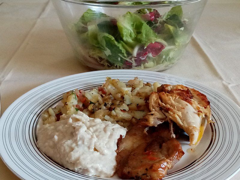 Pražen krompir, hrenov zos, rezina telečje pečenke in piščanca (zaloge iz skrinj