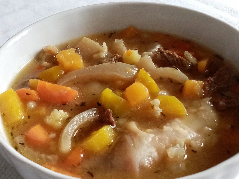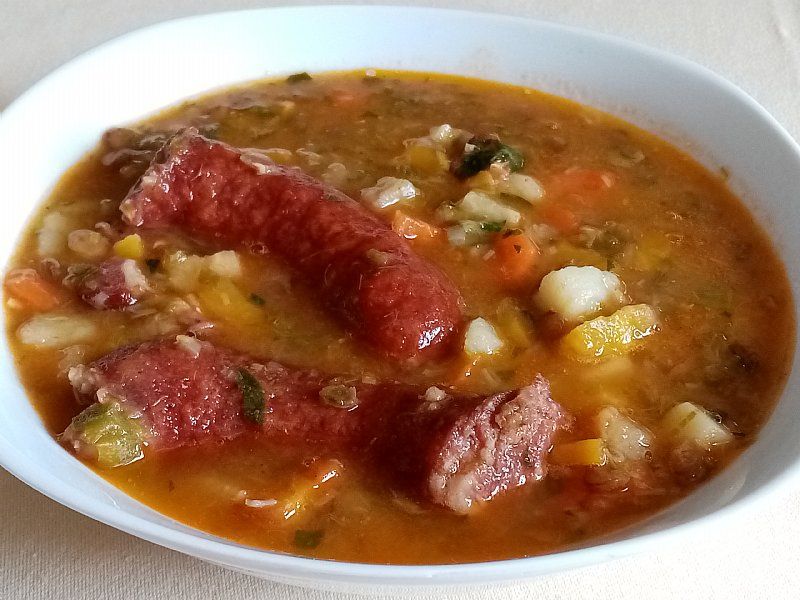Enolončnica s porom, lečo, korenasto zelenjavo in klobaso